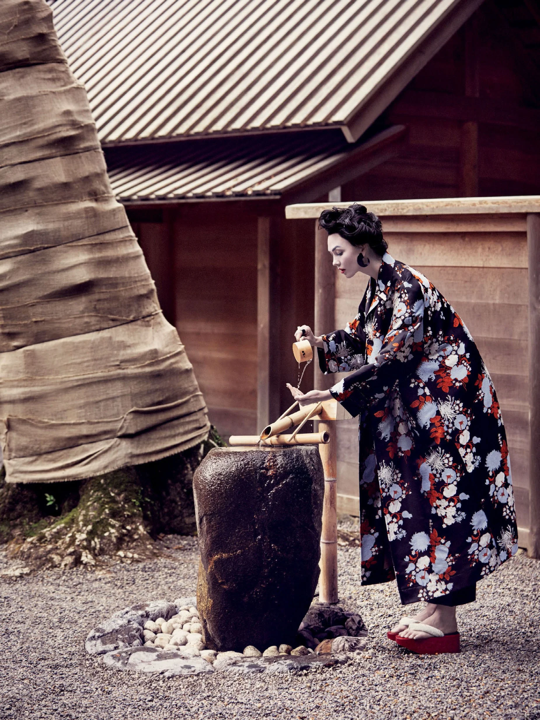 Shot by Mikael Jansson and styled by Phyllis Posnick in Japan's Ise-Shima National Park, "Spirited Away" features Kloss — a white lady from Missouri — dressed up as a Japanese fashion Geisha, engaged in a variety of confusing activities, like carrying a basket of cherry blossoms, looking solemn in a forest and being assisted with what is likely some trendy fitness innovation that involves water and, um, human beer koozies? The spread also includes one of fashion's favorite set-ups when it comes to shooting in other countries: using, as a prop, a decidedly unglamorous, often stereotypical human cultural symbol wearing traditional garb — in this case, a sumo wrestler — posed next to the beautiful white supermodel wearing designer clothing.