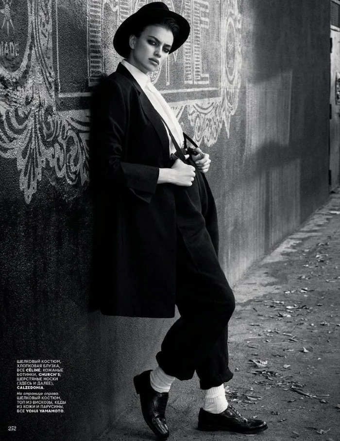 /Russian model Irina Shayk channels a sexy androgynous vibe, styled by Patrick Mackie mixes menswear separates with lingerie pieces, topping off the images with a bowler hat. Luigi & Iango captures the cover story for Vogue Russia March 2017./ Hair by Luigi Murenu; makeup by Georgi Sandev