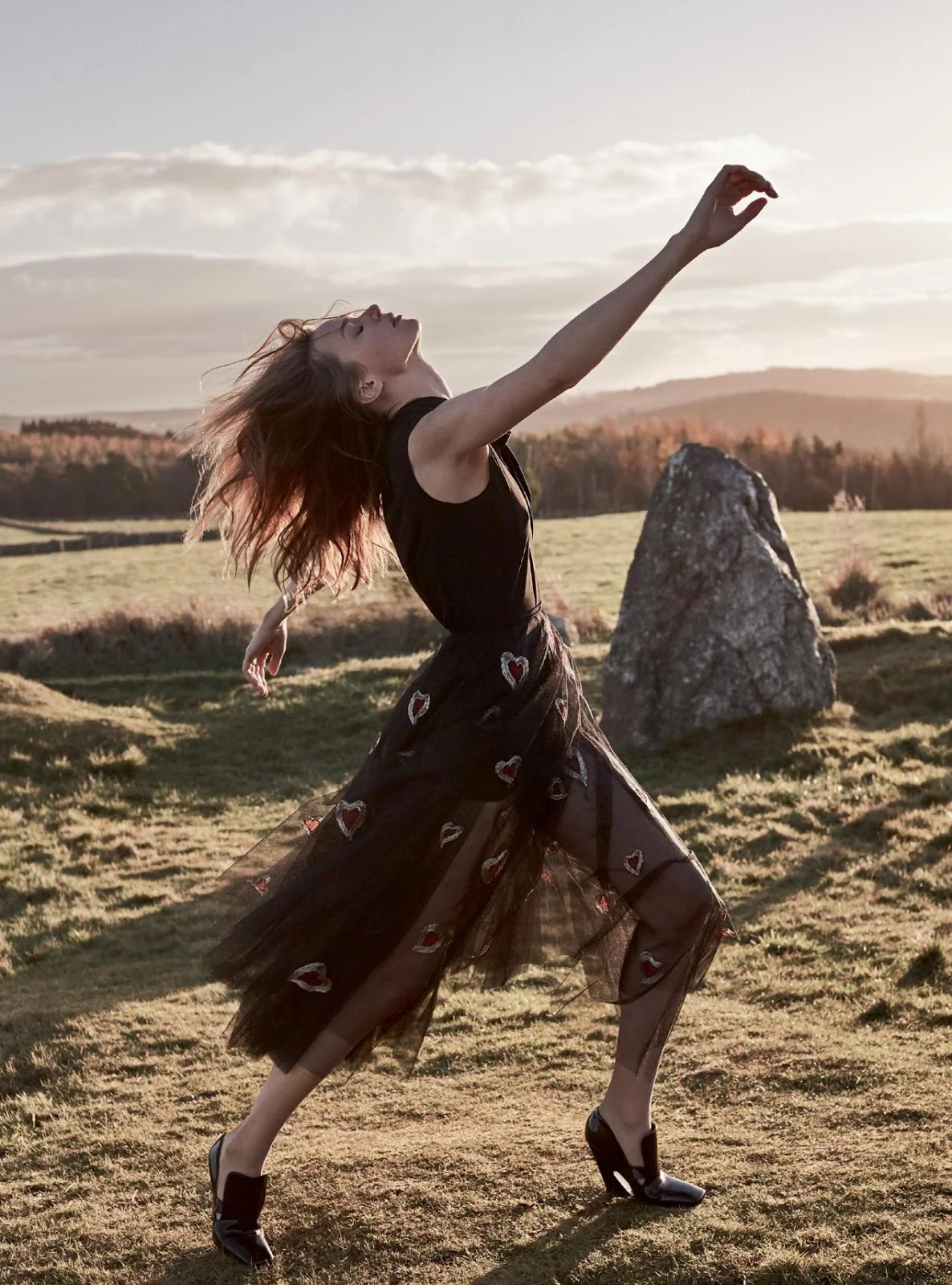 /Model Elise Crombez is styled by Charlie Harrington in 'High Priestess'. Agata Pospieszynska captures Agata on location at Sunhoney Stone Circle & Easter Aquhorthies Stone Circle, Scotland for Harper's Bazaar UK April 2017./ Hair by Koto Suizu; makeup by Marie Thomsen
