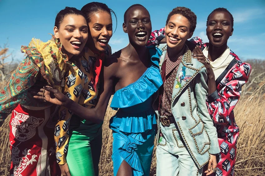 /Models Ajak Deng, Grace Mahary, Jourdana Phillips, Lameka Fox and Nykhor-Nyakueinyang Paul are styled by Katie Trotter in a 'Welcome to the Issue' celebration of the kaleidoscope of color that defines fashion looks for spring/summer 2017. Photographer Silja Magg flashes the beauties for Harper's Bazaar Arabia April 2017./ Makeup by Toni Malt; hair by Seiji
