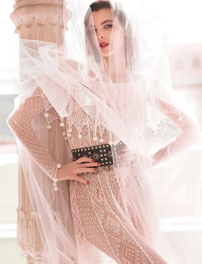 /Top model Vittoria Ceretti is styled by Anastasia Barbieri in 'India Song', a retro mood celebration of colonial India -- which was, of course, conquered by the British. Mario Testino captures the splendor of ruling class lives then and now -- whether French, British or Indian -- for Vogue Paris May 2017 -- an issue devoted to celebrating weddings. / Hair by Christiaan; makeup by Charlotte Tilbury