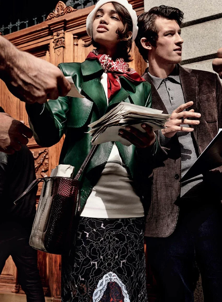 /Brazilian beauty and top photographer favorite, model Ellen Rosa packs her bag for a trip to Madrid with male model Callum Turner. Tonne Goodman styles Ellen in images by Mario Testino for Vogue US May 2017./ Hair by Odile Gilbert; makeup by Stephane Marais