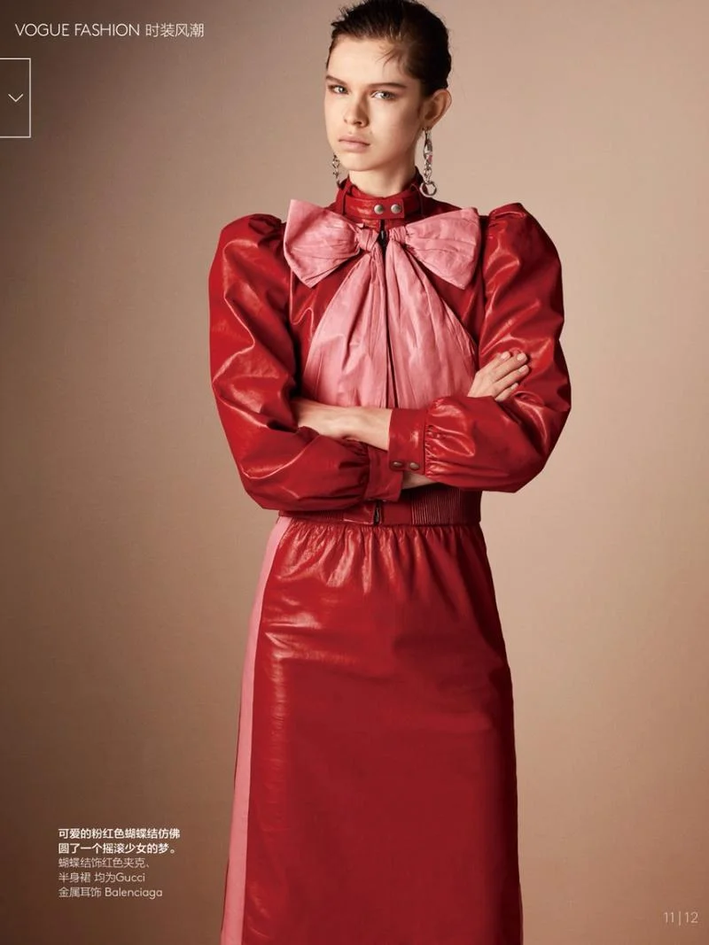 /Model Iris Landstra is styled by Beat Bolliger in colorful, modern sculpted shapes in 'For Leather'. Photographer Paul Wetherell is behind the lens for Vogue China June 2017./ Hair by Kei Terada; makeup by Hiromi Ueda