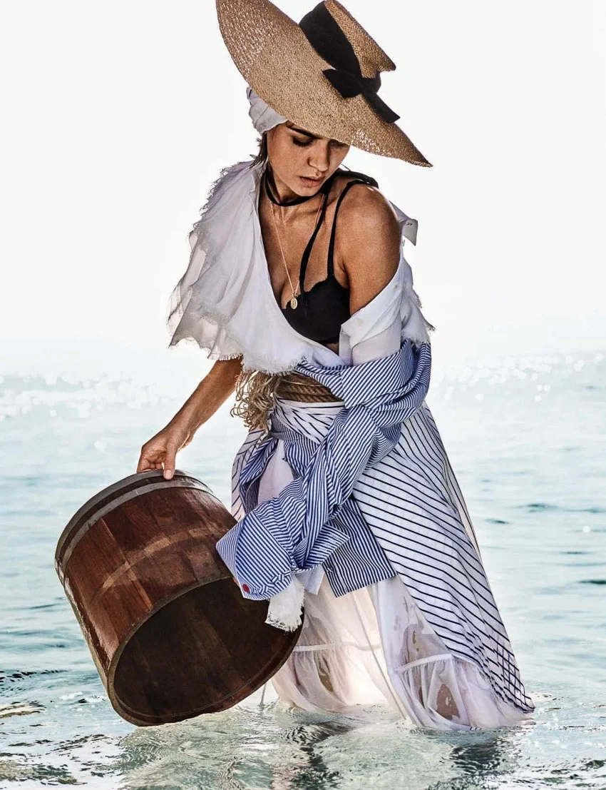 Victoria's Secret Angel Josephine Skriver is a sensual mermaid milkmaid, styled by Christiane Arp in sexy white, blue and natural hues layers. Photographer Giampaolo Sgura captures the visual feast for Vogue Germany June 2017./ Hair by Franco Gobbi; makeup by Jessica Nedza