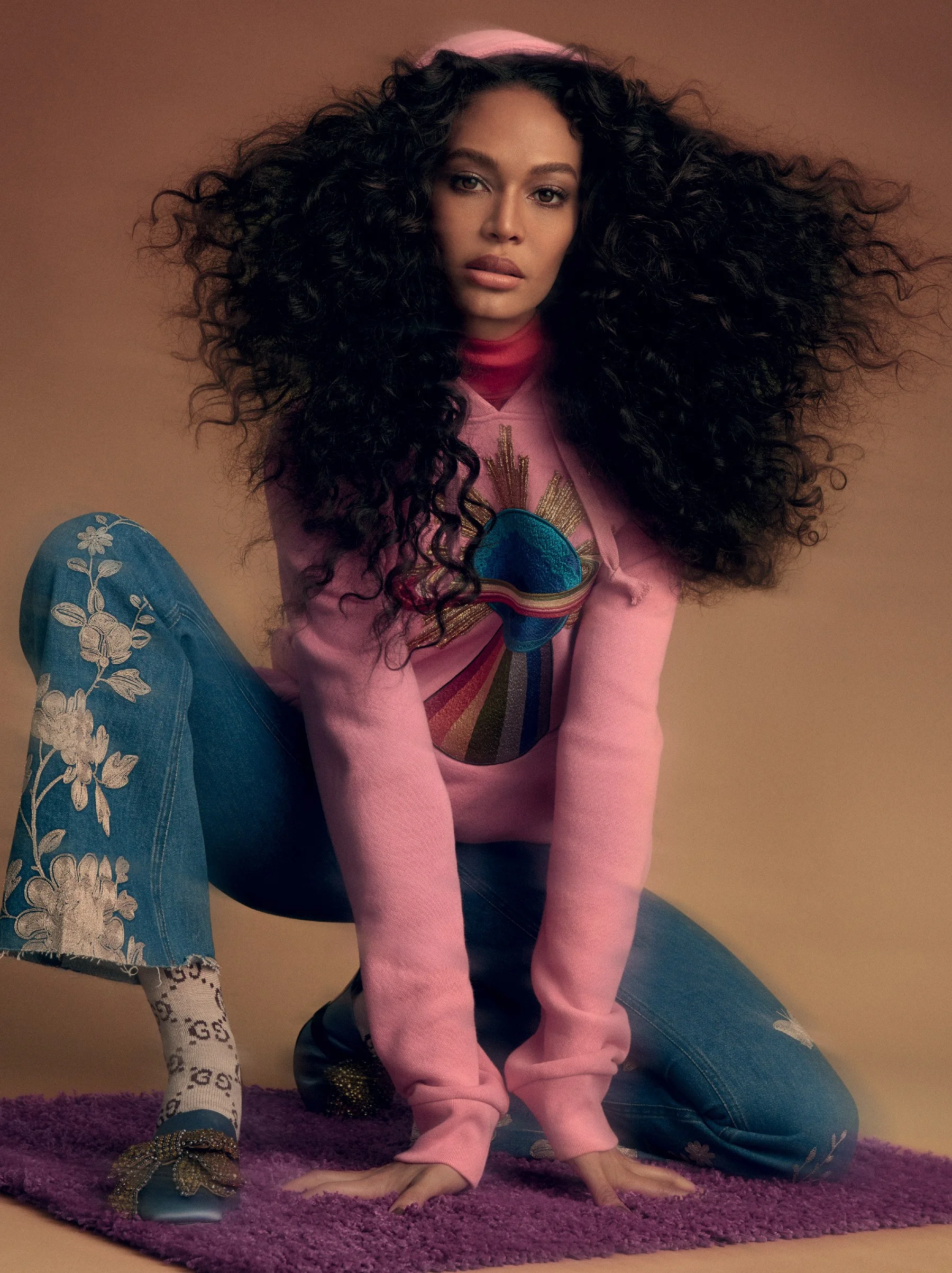 /Supermodel Joan Smalls is styled by Daniel Ueda in color-mixed geometric patterns and prints. Photographer Zee Nunes flashes 'Checkmate' for Vogue Brazil June 2017./ Hair by Kayla Michele; makeup by Virginia Young