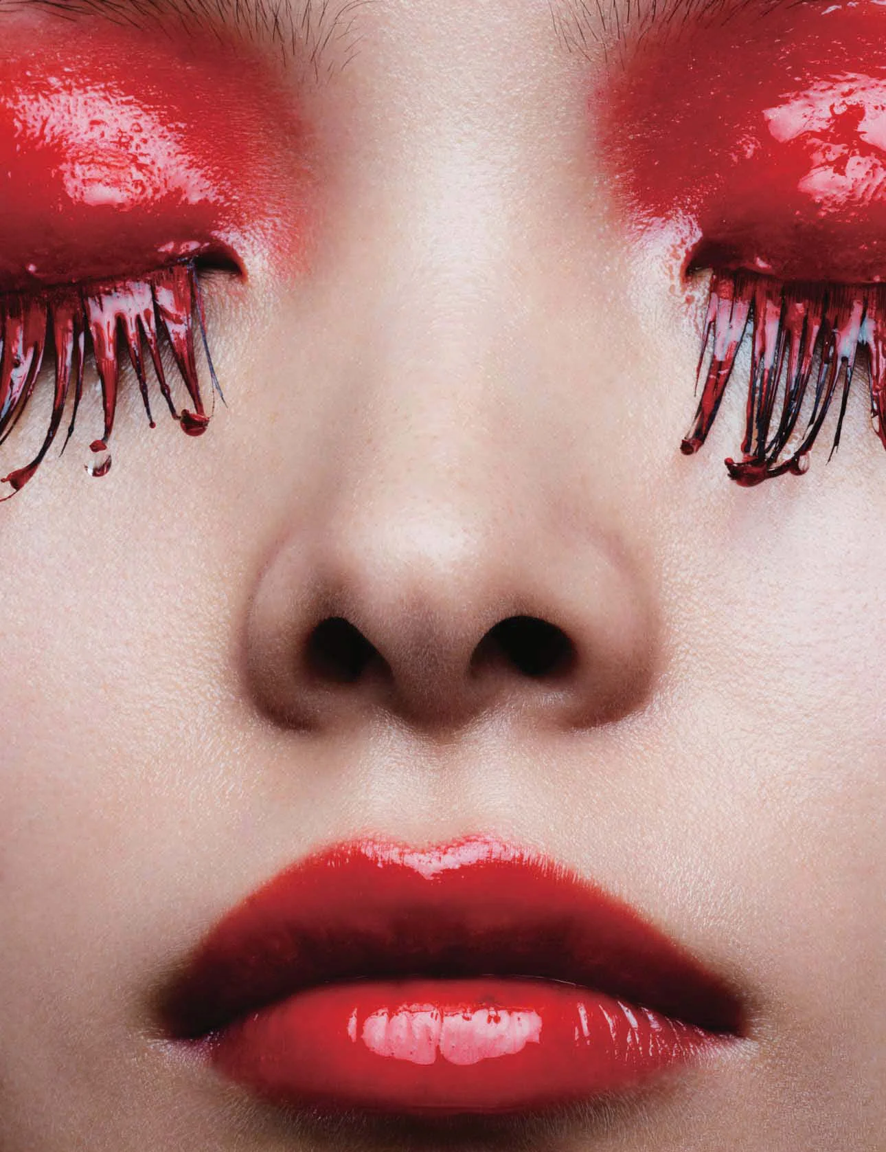 /Model Ling Liu gets the beauty treatment in 'Red Lust', styled by Charles Varenne. Ben Hassett captures the scarlet drama for Vogue China September 2017./ Makeup by Isamaya Ffrench; hair by Peter Gray