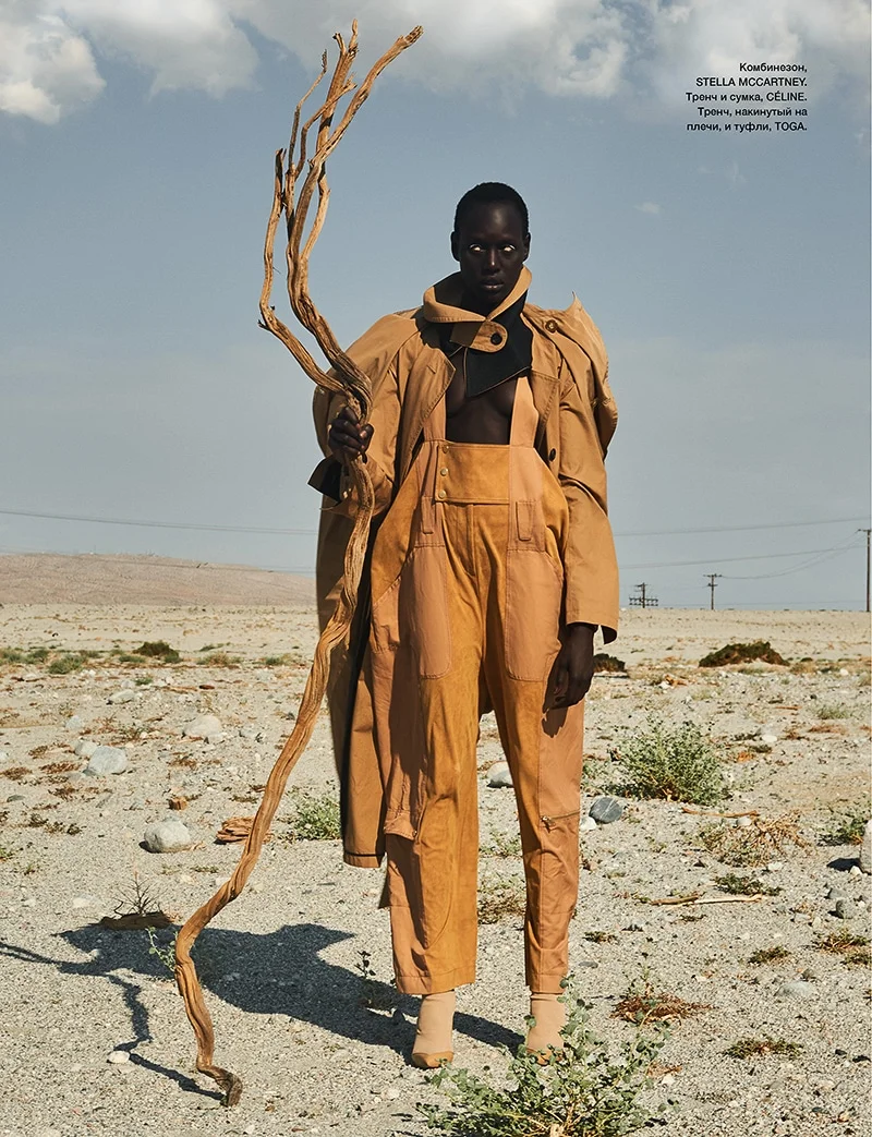 /Top model Ajak Deng is styled by Mar Peidro in desert-sand-inspired colors and fabrics, lensed by Egor Tsodov for Numéro Russia.