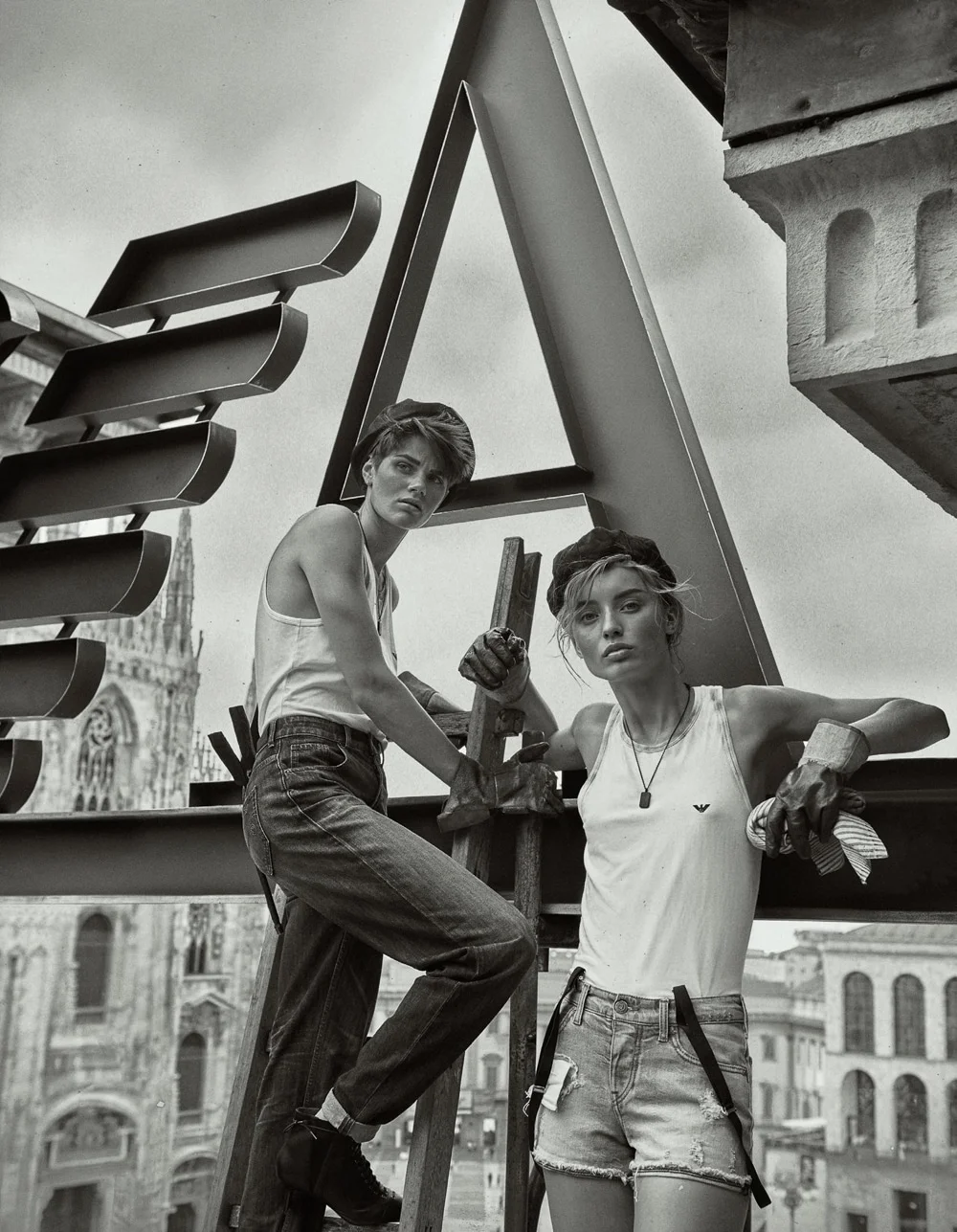 /Giampaolo Sgura captures models Louise Briand, Giulia Maenza, Frankie Cammarata, Marco Belotti, Santiago Ferrari and Trevor Signorino, ready to work. Aurora Sansone and Miguel Arnau fashion in 'The Essence of Emporio Style' for Vogue Japan October 2017./ Hair by Andrew Guida; makeup by Jessica Nedza