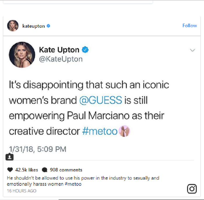 Former GUESS model Kate Upton added her voice to the #MeToo convo Thursday morning, using social media to speak out against Paul Marciano, co-founder of the company.