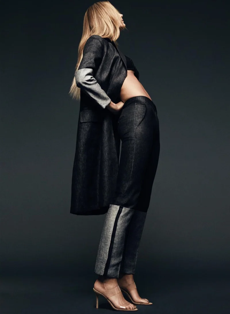 /Kate Bock poses in dark wash denim looks from Max Mara, Tibi and Versus Versace, chic looks that are Vogue Paris worthy styled by Juliana Schiavinatto. Photographer Owen Bruce is in the studio, flashing 'Dark Matter' for Elle Canada April 2018./ Hair by Cia Mandarello; makeup by Susana Hong