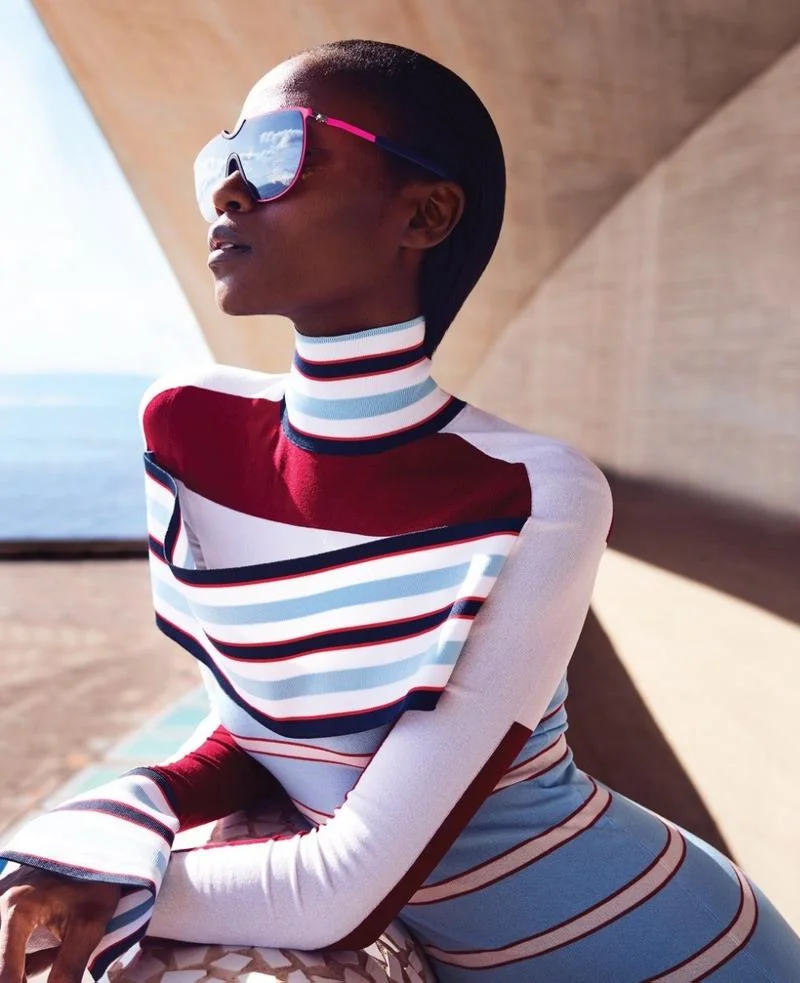 /Model Riley Montana is styled by Kerstin Schneider in graphic, sporty modernism for 'Spring Training', lensed by Marcin Tyszka for Harper's Bazaar US March 2018./ Makeup by Florrie White; hair by Daniel Martin