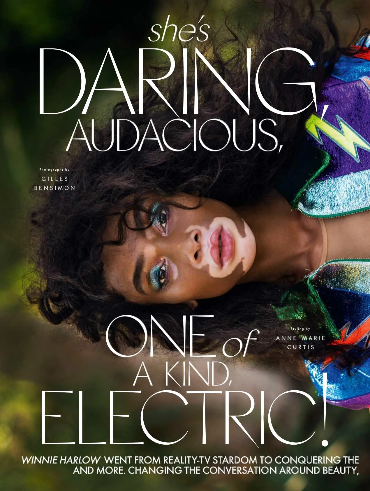 /Model Winnie Harlow covers the May 2018 issue of ELLE UK, lensed by Gilles Bensimon with bird of paradise fashion looks styled by Anne-Marie Curtis.