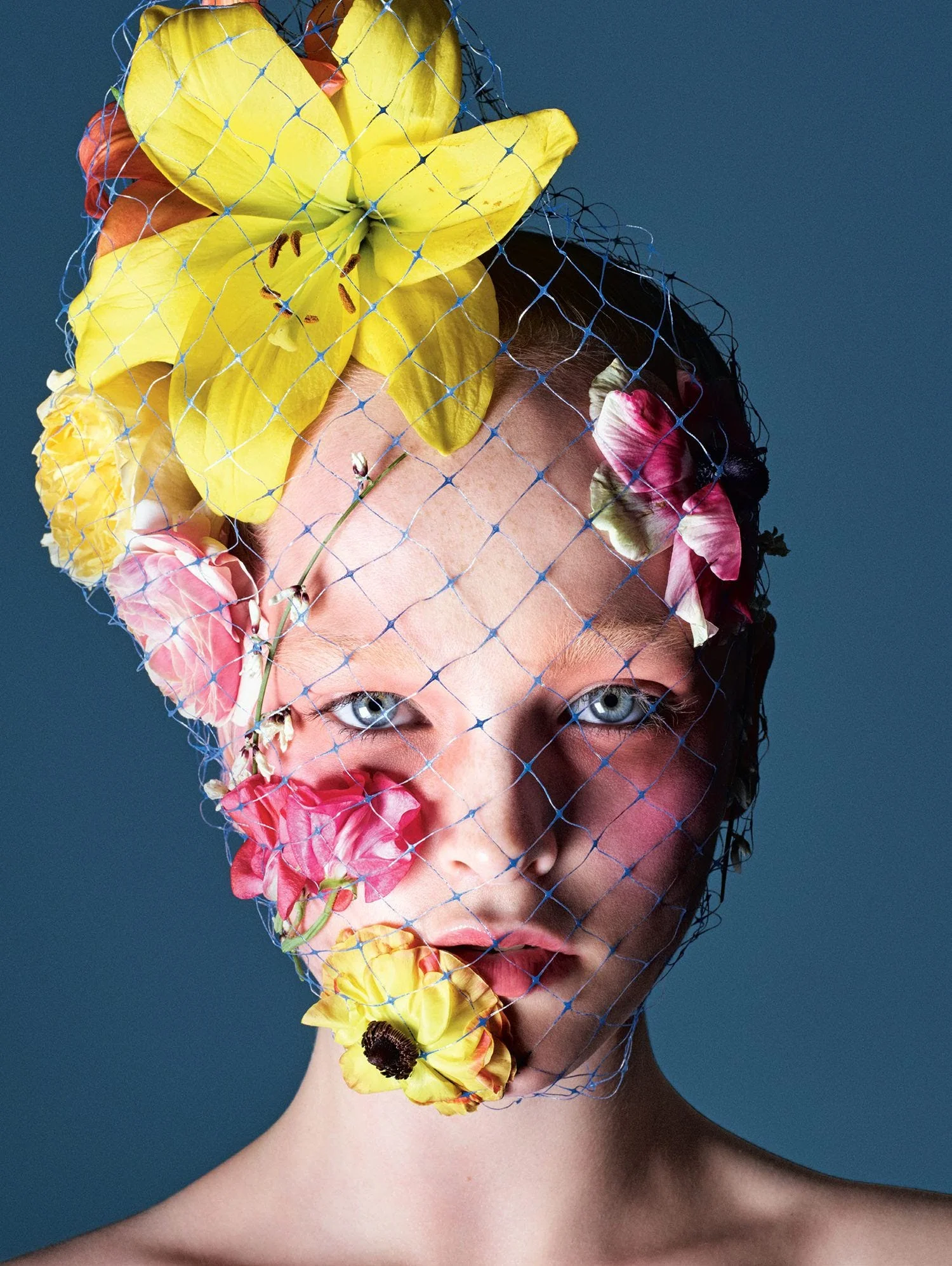 /Model Jean Campbell is in full-floral hairpiece regalia, styled by Jaime Kay Waxman. Daniel Jackson is behind the lens, flashing 'Avant Garden' for Allure US June 2018./ Hair by Bob Recine; makeup by Kanako Takase