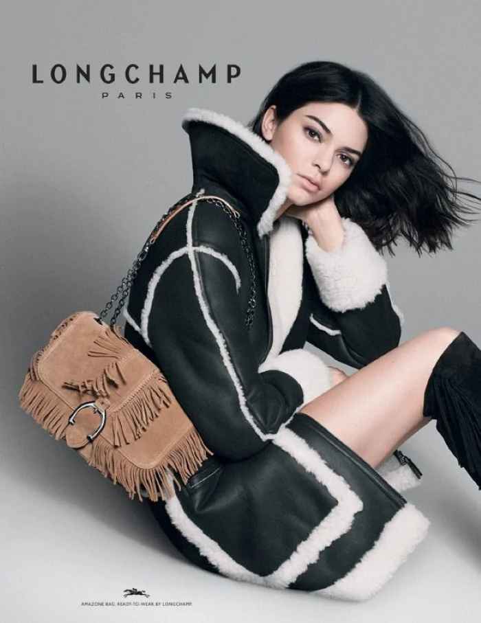 “The spirit of the campaign is notable for its youth, freshness and sensuality. Each of the three double-page spreads juxtaposes two visuals, a portrait and a silhouette, in a dynamic layout which highlights different facets of the “modern Amazon”. Kendall is by turns feisty in a lamb and rabbit-fur coat with black and orange zigzag stripes, sexy in a fluid velvet tuxedo, and irreverent in a sumptuous shearling coat which showcases Longchamp’s heritage of leather craftsmanship. In each visual, she wears a variation on the season’s star Amazone bag, as if to make the point that the three moods are all expressions of one and the same personality.“