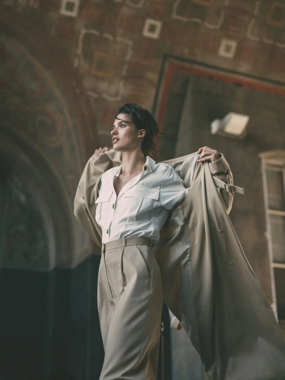 Julia Van Os Wears Classic Trenches Lensed By Sebastian Sabal-Bruce For Porter Edit Aug. 3, 2018