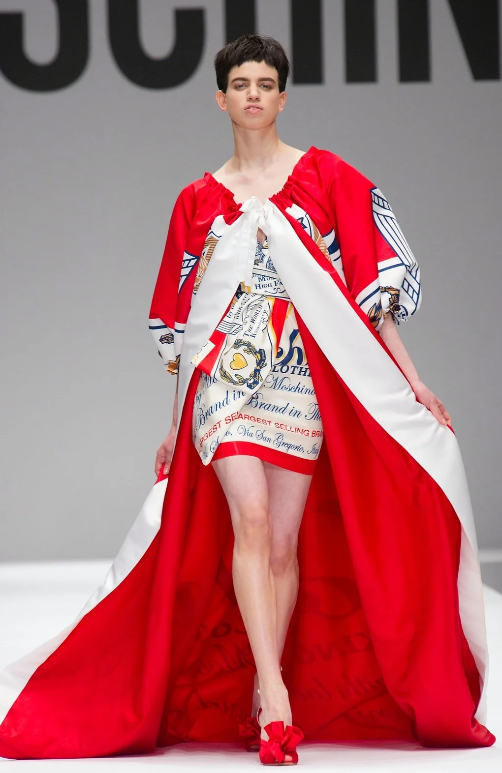 According to a press release, the collaboration "showcases Moschino's iconic play on cultural cornerstones and encapsulates the strong visual impact of the integration of both seminal brand logos," recalling the dress and cape look previously designed by Scott that was put on display in the MET's Costume Institute Spring 2019 exhibition, "Camp: Notes on Fashion."