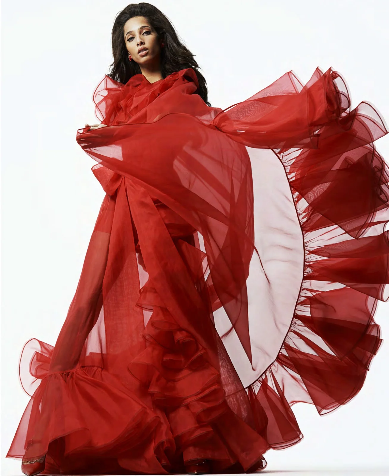/Miguel Enamorado styles Dutch model Yasmin Wijnaldum in ‘Frill Seeker’, lensed by Sebastian Kim for Harper’s Bazaar US March 2019./ Hair by Hiro+Mari; makeup by Yumi Mori