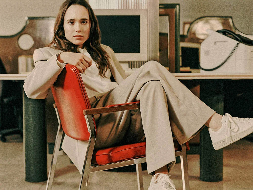 /Canadian actor Ellen Page is styled by Tracy Taylor in designs from Helmut Lang, Theory, Jason Wu, Carcel, Saint Laurent, Joseph, Max Mara, Bottega Veneta, Givenchy, Alexa Chung and more. Photographer Tiffany Nicholson captures the reflective Page in Stella McCartney and Veja sneakers for the February 2019 cover story ‘Taking the Lead’ on Porter Edit. / Hair by Edward Lampley; makeup by Frankie Boyd