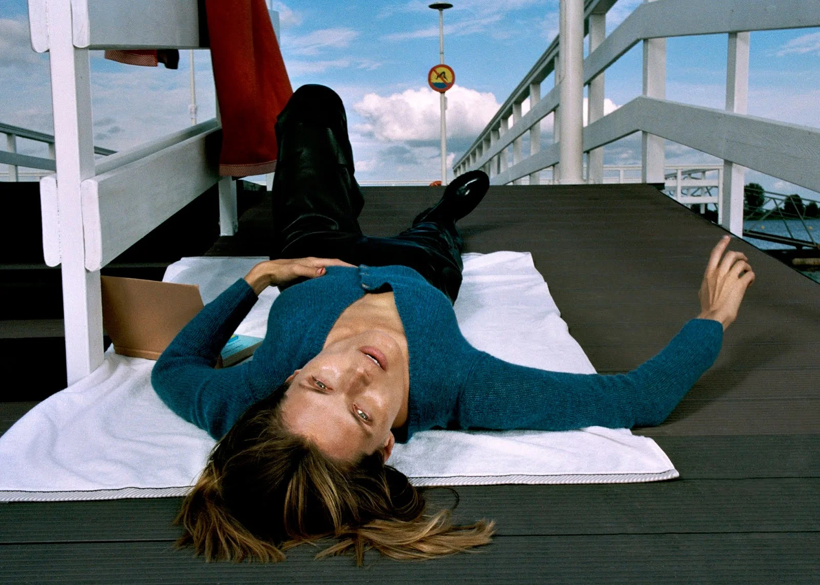 “My lifestyle is much healthier now. Twenty years ago, it was mostly coffee and cigarettes and being constantly on the run,” she says. “Now I love to eat well, sleep well and I need some kind of sport to mentally feel good in my skin.” She swims for an hour a day, five days a week, and uses a noncommittal mix of natural, organic skincare. “I’m very happy to put anything on my face that smells edible and feels like oil. That’s what happens after you hit 40 – you learn how to treat yourself with a bit more love.”