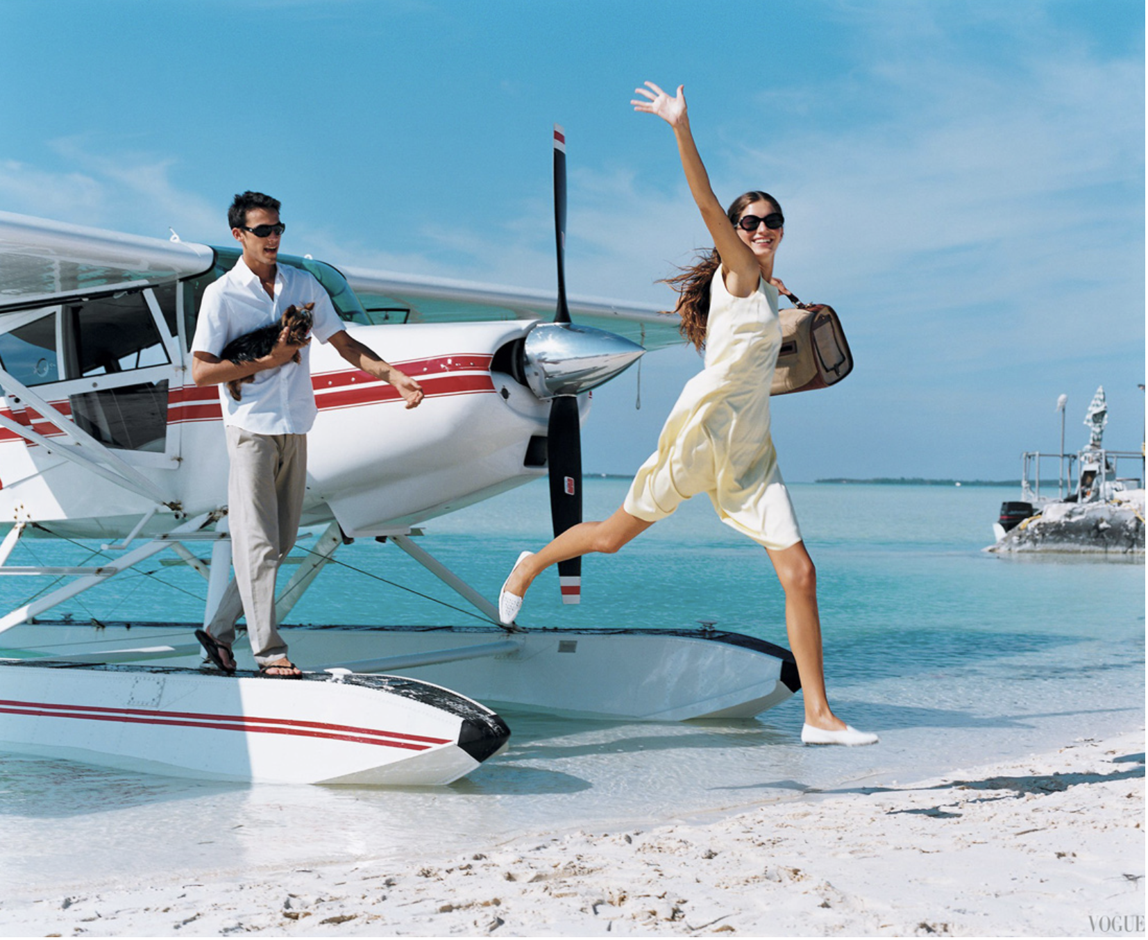 In April 1999, Gisele dropped down in the Caribbean, accompanied by model Scott Barnhill. Grace Coddington styled the all-American getaway fashion story lensed by Arthur Elgort./ Hair by Didier Malige; makeup by Christy Coleman
