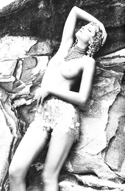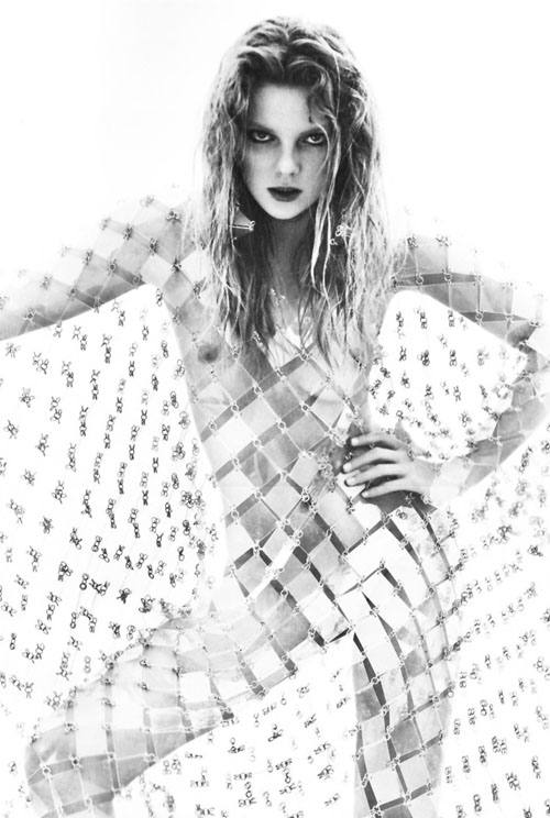 Eniko Mihalik becomes a 21st century, organic goddess and not a space cadet. Modern mesh returns to the world of knights in shining armor. The photography is not technicolor but black and white. Reality is blurred and gainy — precisely the world the world in which ancient goddesses live today.