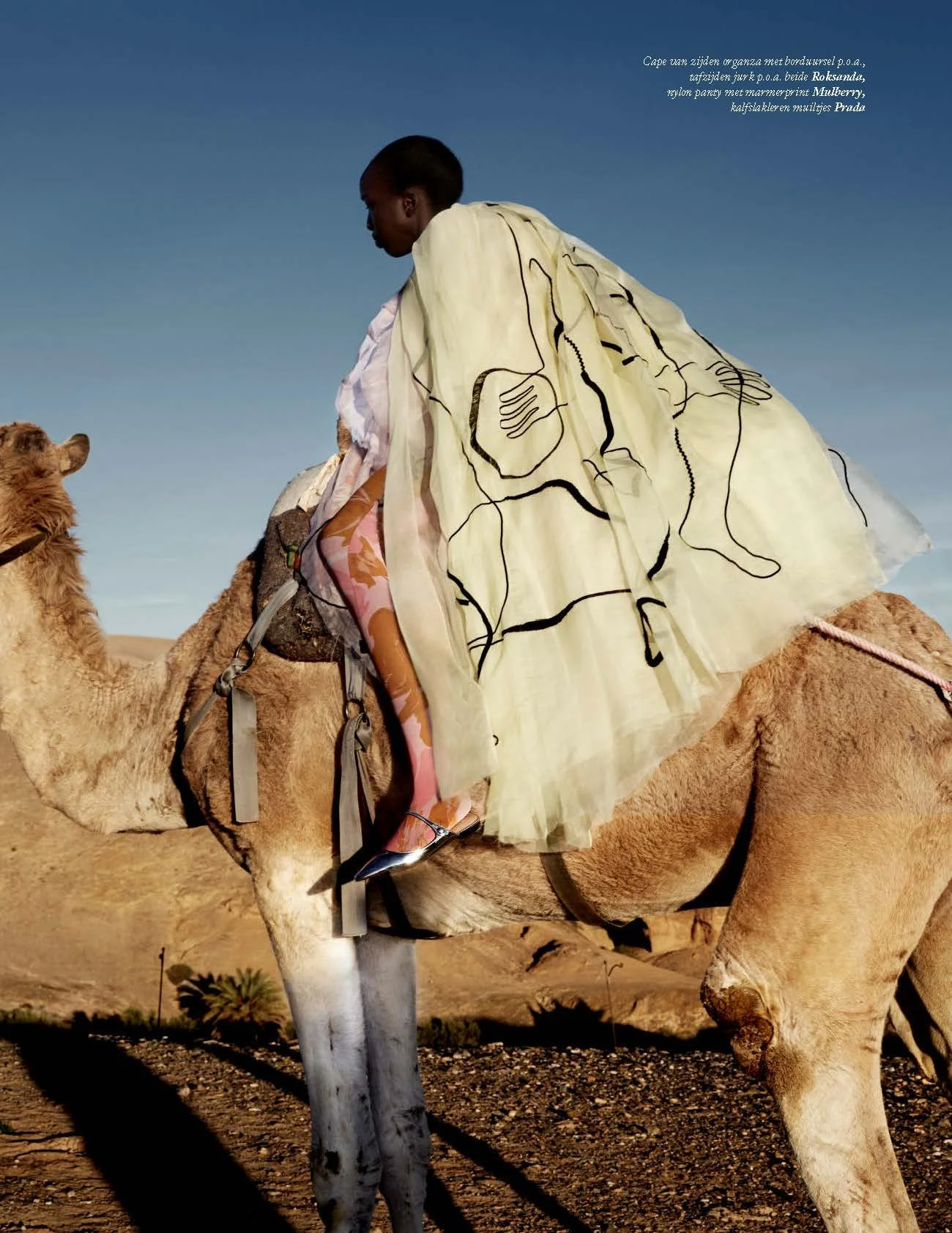 South Sudanese, Britain-raised model Niko Riam is styled by Dimphy den Otter in ‘Free Your Mind’. Carlijn Jacobs makes the desert capture for Vogue Netherlands March 2019./ Makeup by Suzanne Verberk