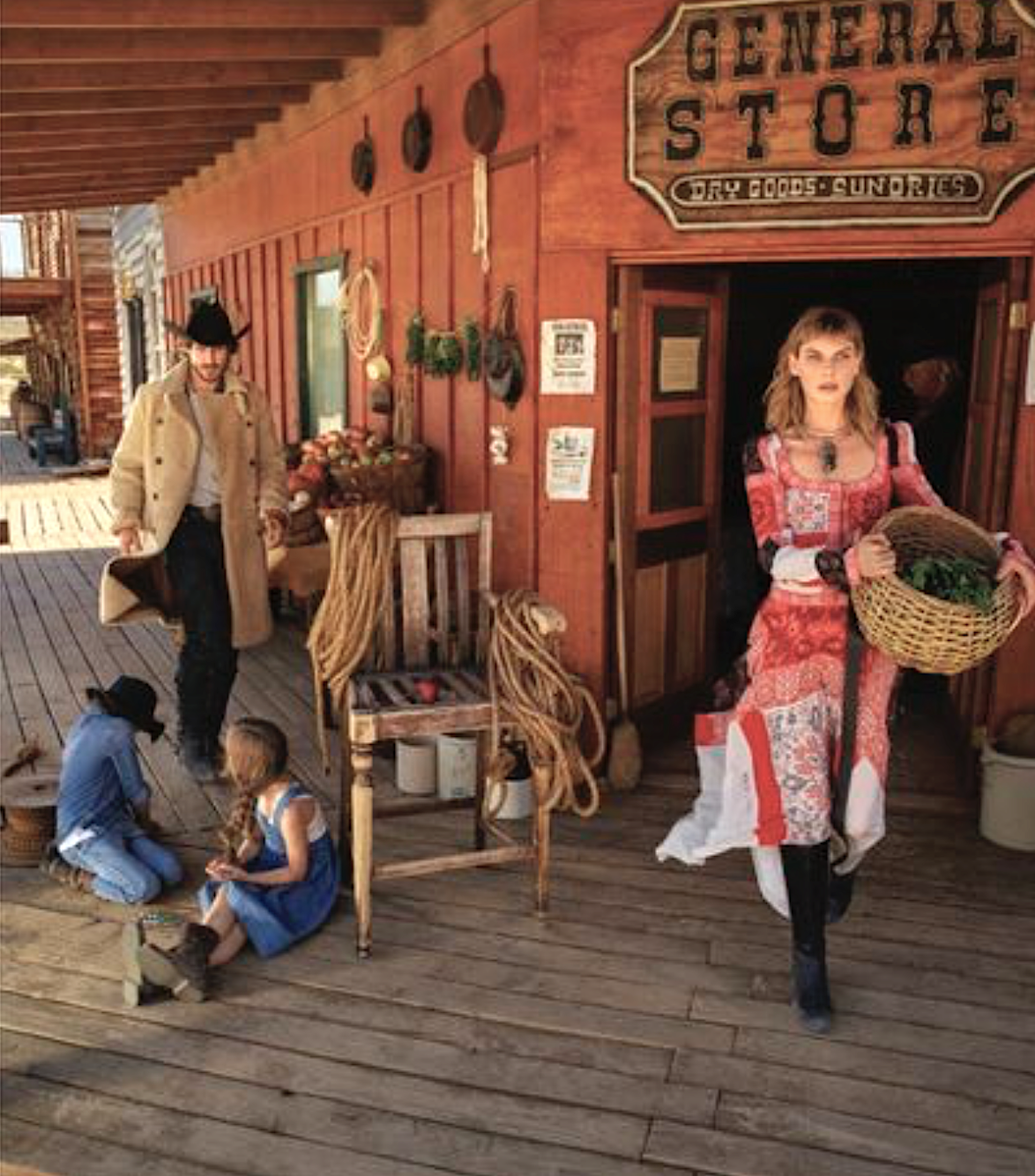 Model Angela Lindvall is styled in prairie girl looks by Joanna Hillman. Mariano Vivanco captures American spirit in 'True West' for Harper's Bazaar US September 2017. / Hair by Peter Savic; makeup by Morgane Martini; set design by Gille Mills