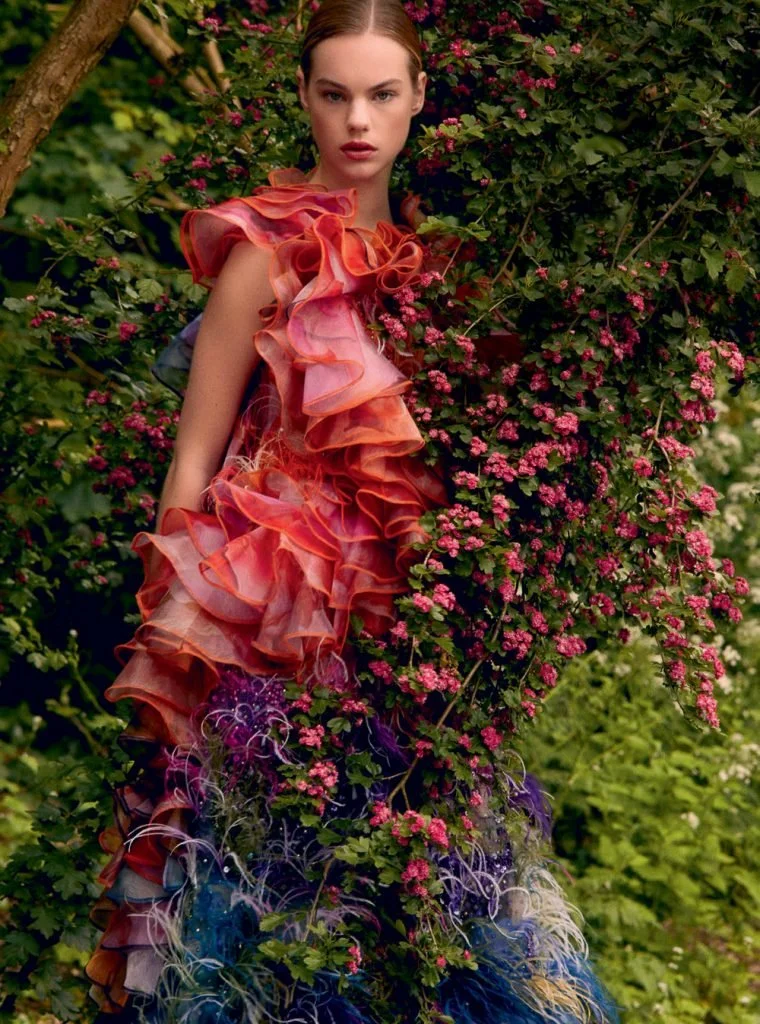 /Model Estella Boersma poses in ‘Majesty and Meadowsweet’, a hyper-feminine collection of elegant dresses styled by Miranda Almond. Photographer Betina du Toit captures the beauty layers against the incomparable backdrop of nature for Harper’s UK September 2019. / Makeup by Rebecca Wordingham; hair by Bjorn Krischker
