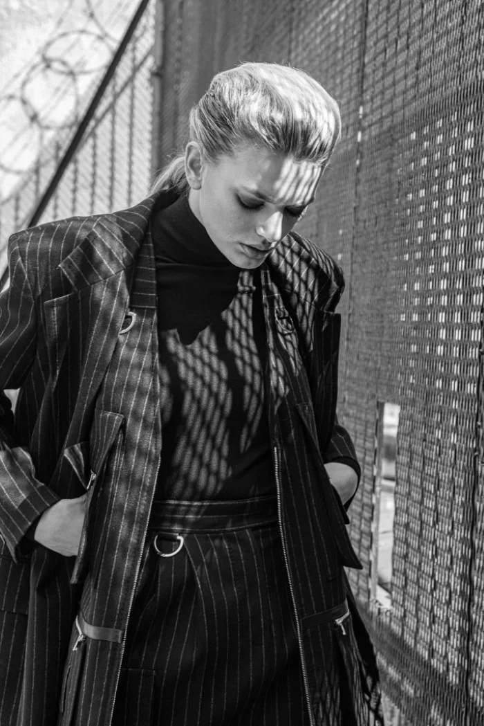 /Bregje Heinen suits up in noble origins patterned fabrics styled by Newheart Ohanian, Beyonce’s ‘Lemonade’ stylist who also includes Zendaya and Serena Williams on her clothes closet list. Photographer Eniko Szucs captures the smoldering Dutch model in ‘A Girl above the City’ for Numero Russia September 2019./ Makeup by Victor Noble; hair by KIYO Igarashi