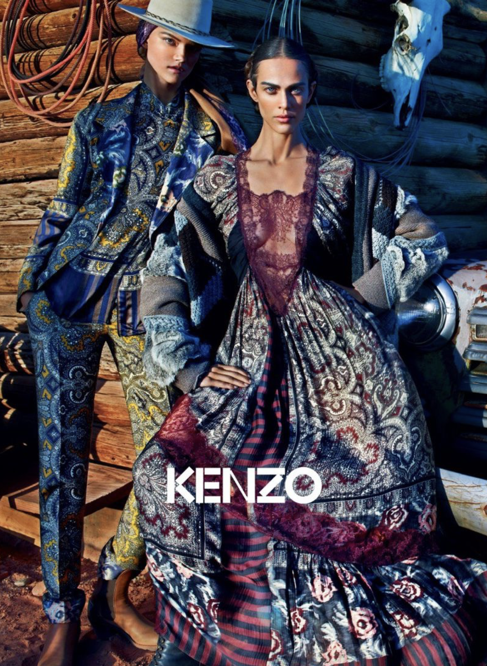 Joined by male model Clément Chabernaud, Aymeline Valade and Kasia Struss celebrate the American West in Kenzo’s fall 2011 campaign photographed by Mario Sorrenti. The influences of Frida Kahlo and Georgia O’Keeffe are strong, especially with Kenzo’s lavish take on a Mexican rebozo shawl.