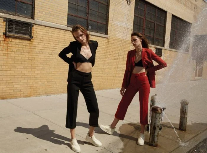 /Models Georgia Hilmer and Emma Oak have some hot fun on city streets in 'Water World' sexy, edgy suiting separates styled by Ilona Hamer. Photographer James Nelson is behind the lens for Russh Magazine October/November 2015./ Hair by Jenny Kim; makeup by Laura Stiassni