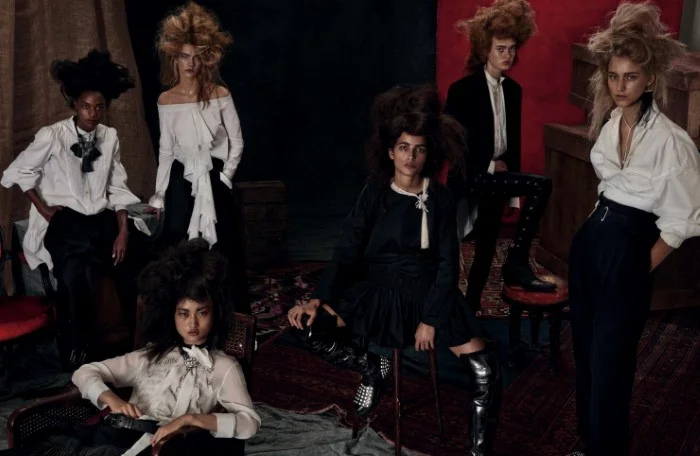 /Model Emmy Krüger, Eva Berzina, Jing Wen, Karly Loyce, Luping Wang and Steph Smith showcase fashion's luxe, global looks styled by Christiane Arp as 'Tour Du Monde'. Photographer Giampaolo Sgura captures the dark mood for Vogue Germany December 2015./ Hair by Franco Gobbi; makeup by Jessica Nedza