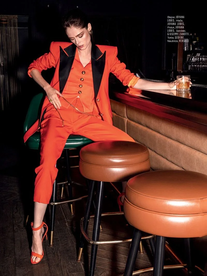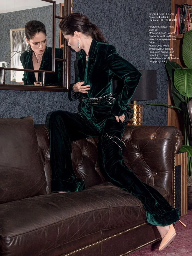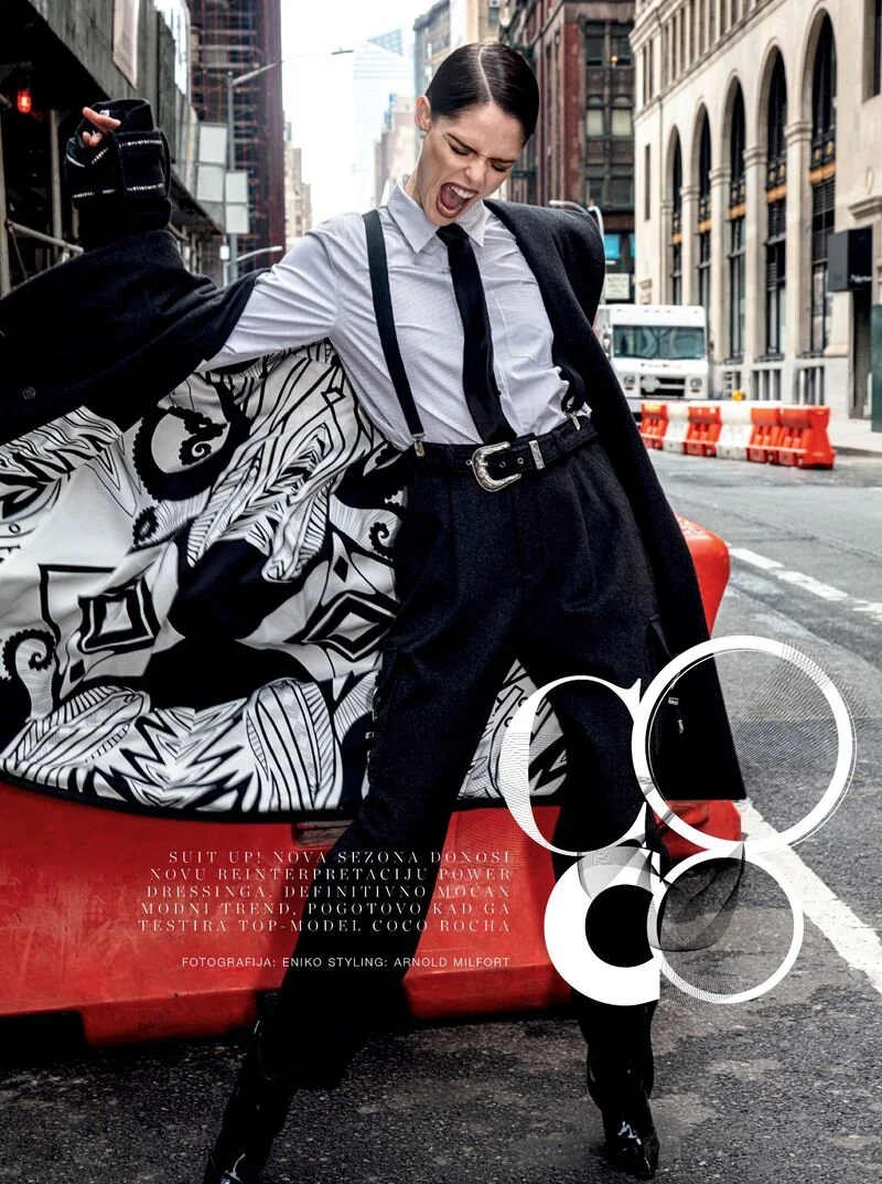 Top model Coco Rocha is styled by Arnold Milfort in hi-voltage menswear lensed by Eniko Szucs for ELLE Croatia October 2019./ Hair by Ledora Francis; makeup by Renee Garnes
