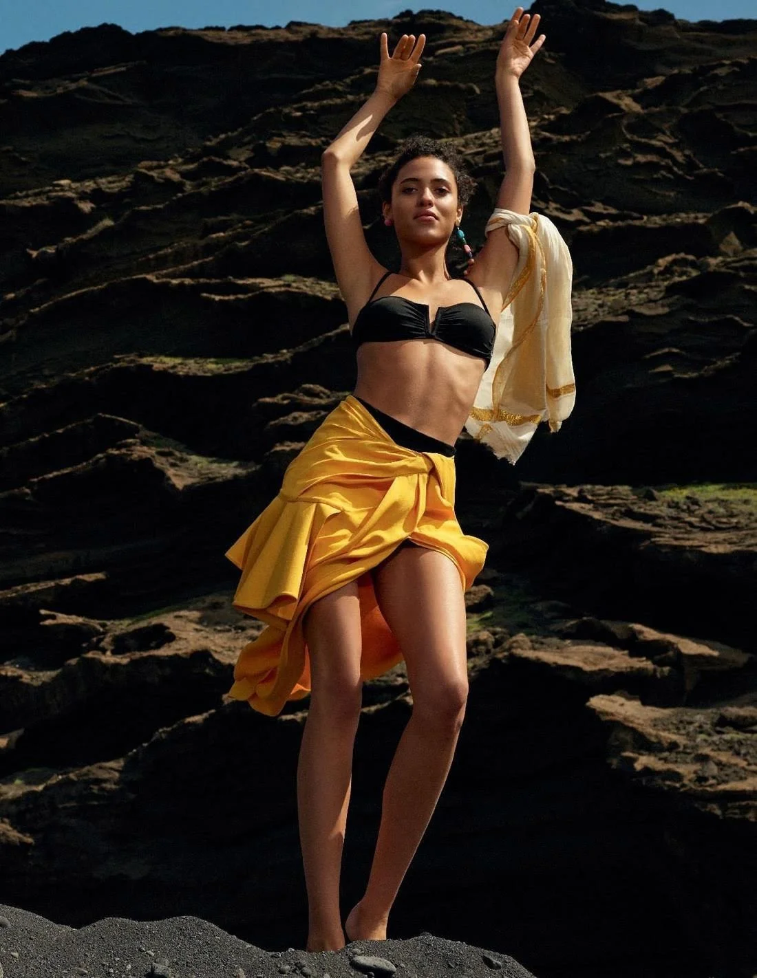 /Micaela Sessa styles 'Mare Nero', a collection of spare, colorful beachwear lensed by Fabrizio Ferri for Elle Italia July 2018./ Hair by Gabriele Trezzi; makeup by Cosetta Giorgetti