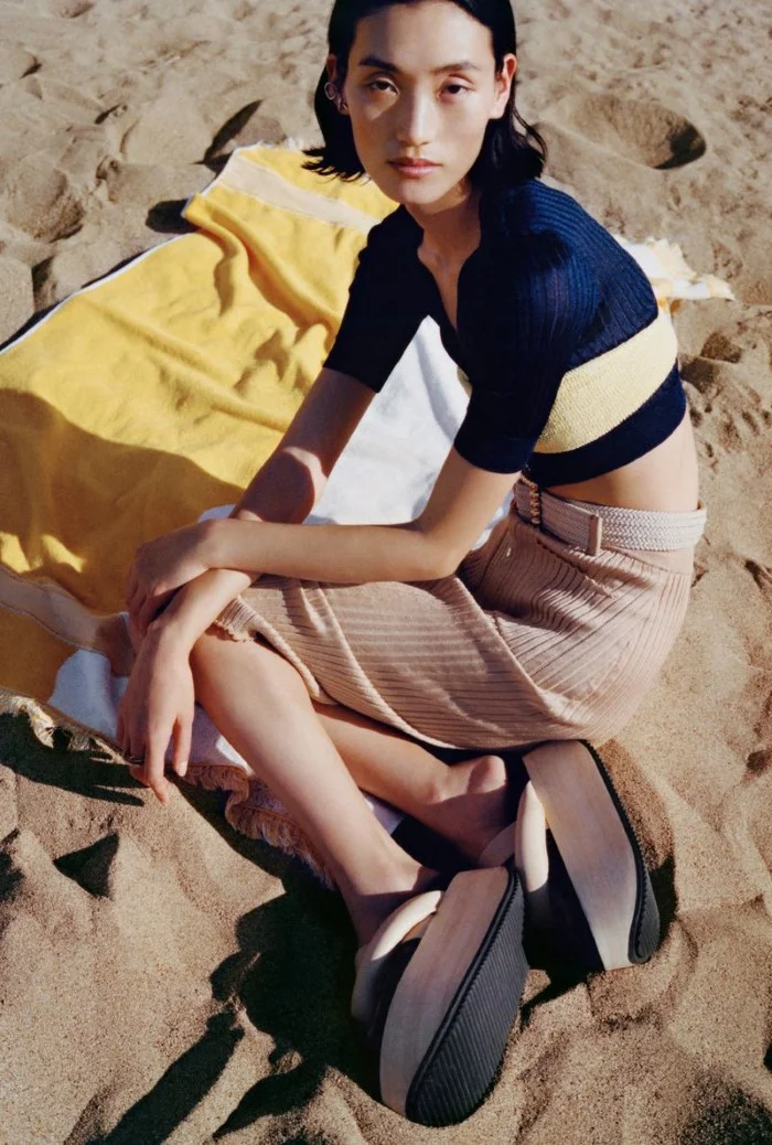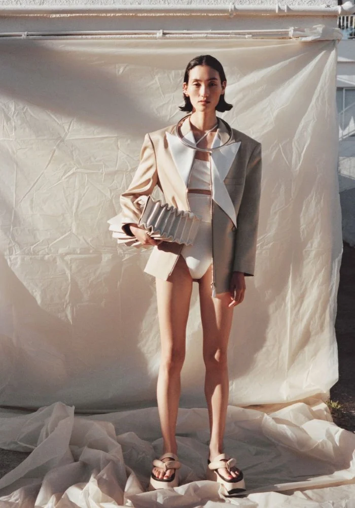 /Model Lina Zhang is styled by Hannah van Well in ‘City Beach’, lensed by Jen Carey for Vogue Netherlands June 2019./ Makeup by Suzanne Verberk