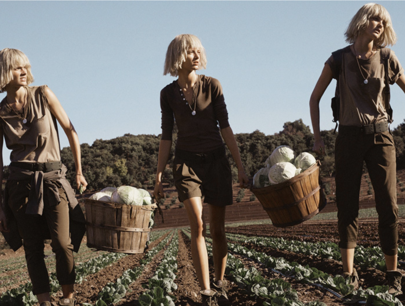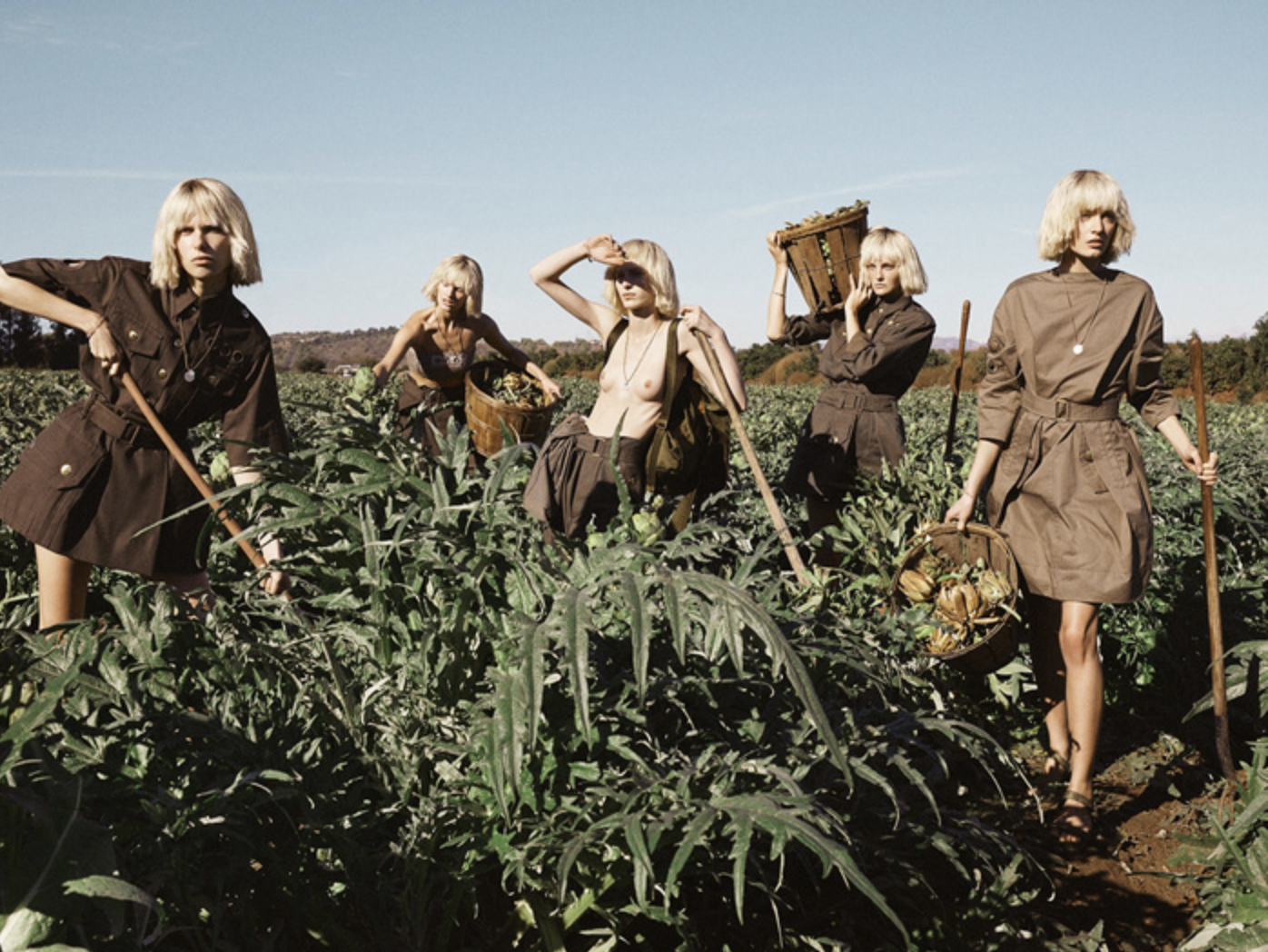 In developing countries the women are often in charge of agriculture until the tractors arrive. Then men hop on board. Models Caroline Trentini, Constance Jablonski, Daria Strokous, Julia Nobis and Lina Berg toil the soil and tend the artichokes in ‘Commune’, lensed by Mikael Jansson for Interview Magazine February 2015./ Makeup by Mark Carasquillo; hair by Tom Jidai