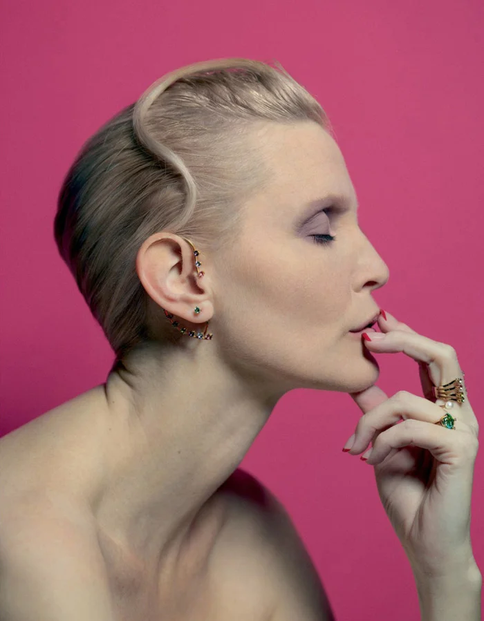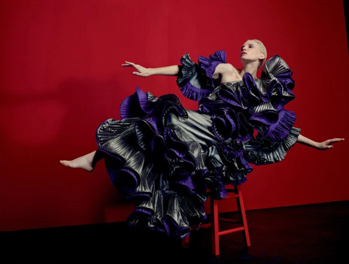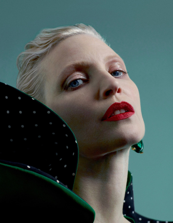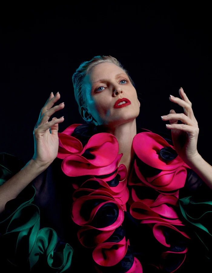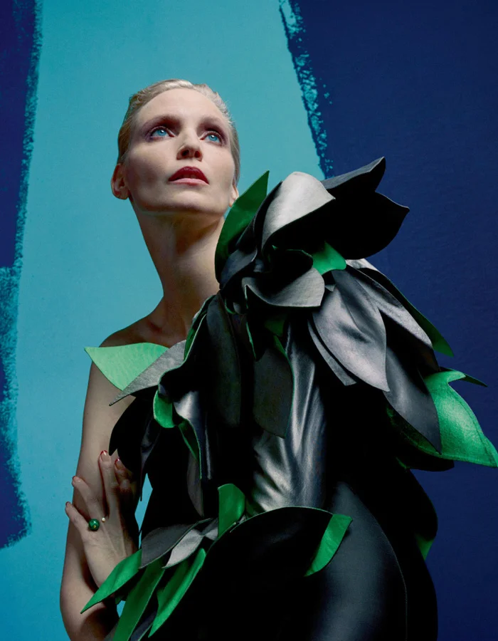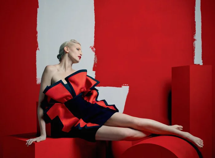 /Model Nadja Auermann is a fashionable art piece, styled by Robbie Spencer in curvaceous, bold color and modern architecture design. Photographer Matthew Stone is behind the lens for A Magazine Spring/Summer 2015./ Hair by Raphael Salley; makeup by Gemma Smith-Edhouse