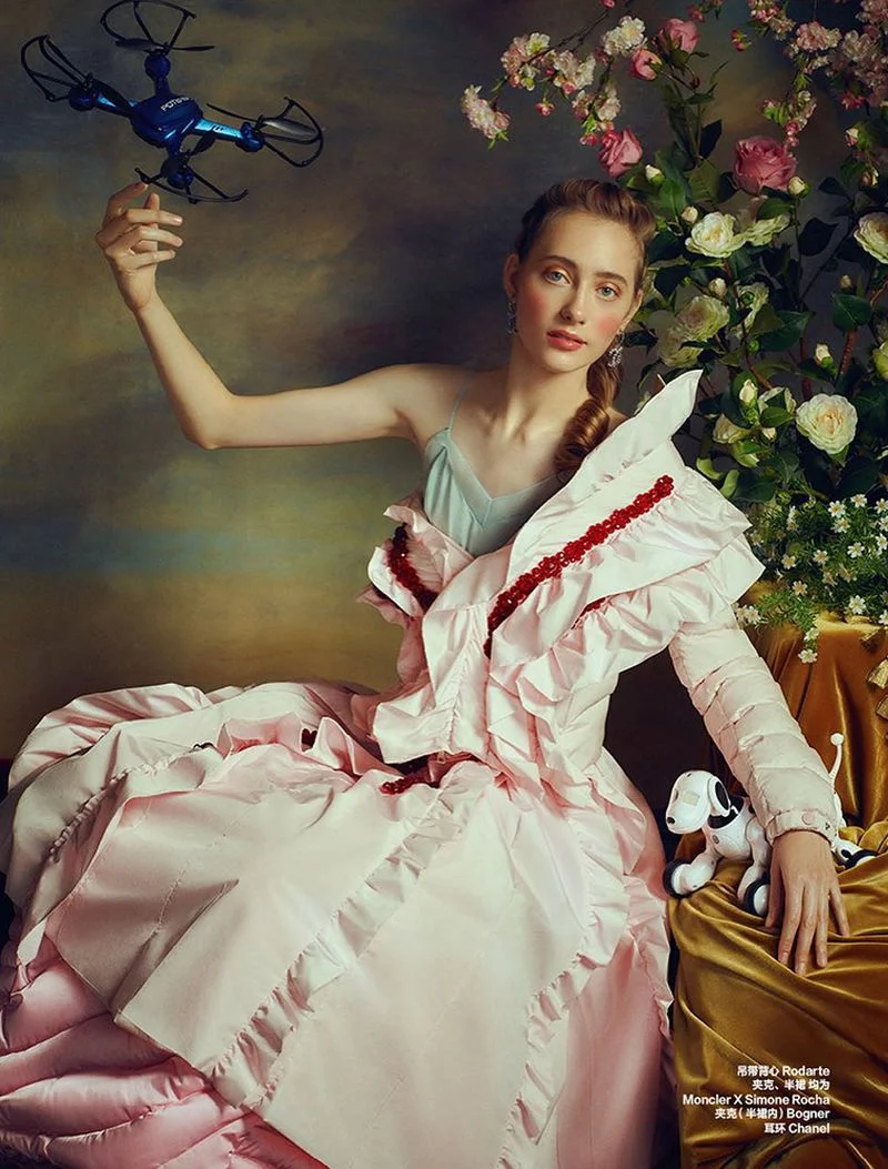Models Lia Pavlova and Kit Butler are styled by Aeri Yun in ‘Tech Dream’, compositions of modern fabrics and silhouettes in an old-world setting. Photographer Shxpir creates the fashion tableaus for Harper’s Bazaar China January 2019./ Hair by Leonardo Manetti; makeup by Misuzu Miyake; set design Todd Wiggins