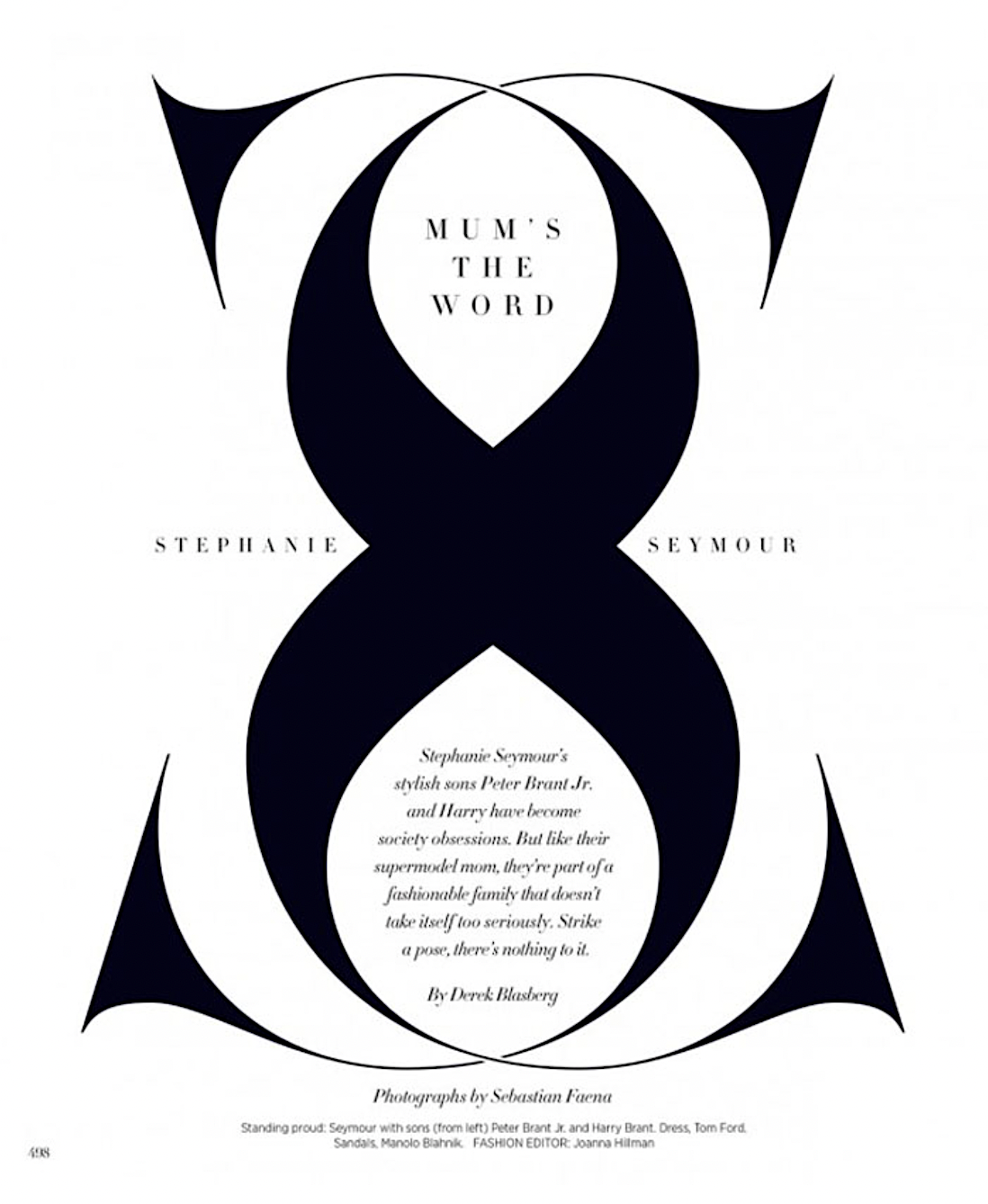 It was only last week that Estee Lauder announced that 45-year-old Stephanie Seymour was the latest face of Estee Lauder. This gem of a fashion editorial by Sebastian Faena with Stephanie hanging out with sons Peter Brant Jr. and Harry Brandt in ‘Mums the Word’ just might a few tongues wagging in that bastion of propriety cosmetic empire.