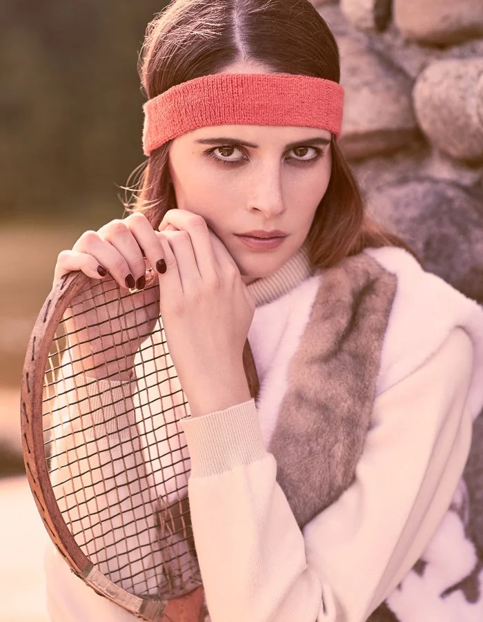 Model Suzie Bird strikes a relzed, retro-elegance, Bush-family pose lensed by Chris Nicholls. Renata Kharkova styles the blueblood, prep-school looks for Elle Russia November 2015./ Hair and Makeup by Simone Otis