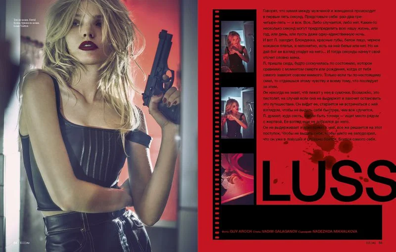 Guy Aroch is behind the lens for ELLE Russia, flashing Sasha Luss, who is determined to get an Oscar in five years. The model tells Vulture that she seeks sweet revenue in the movie. when “highly annoyed she pistol-whips an arrogant fashion photographer with nothing but his own camera, snapping photos of the haute couture humiliation as it happens. Models are going to love me for it!.” Luss predicts.