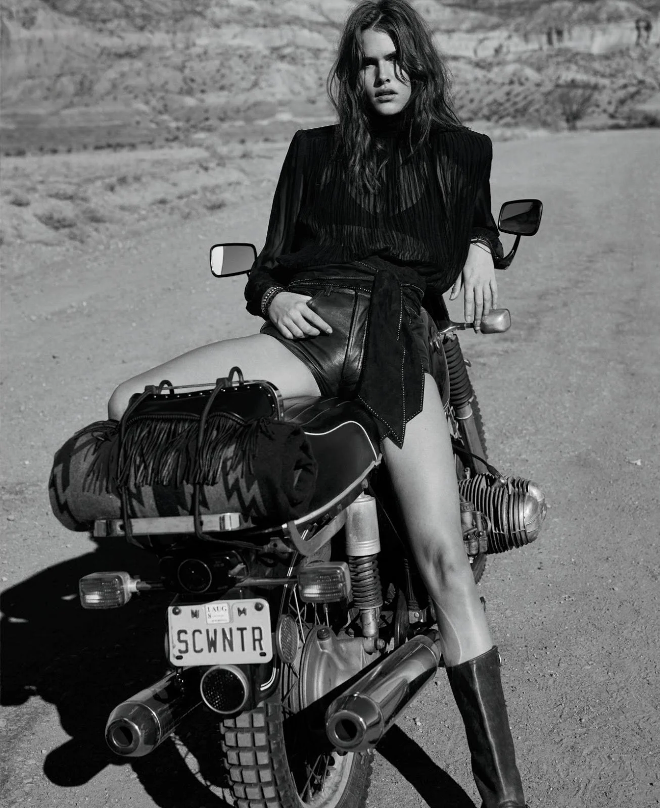 Model Vanessa Moody is styled by Katie Mossman in ‘Motorcycle Diaries’, lensed by Sebastian Kim for ELLE US April 2019./ Hair by Diego Da Silva; makeup by John Mckay
