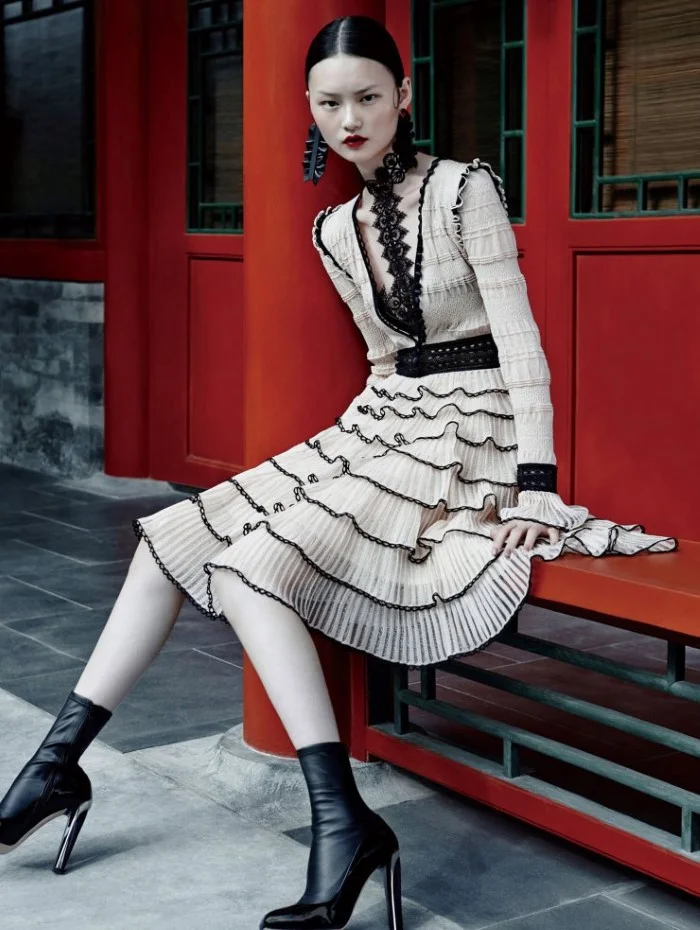 Model He Cong is center stage, styled in embellished elegance for ‘A Romantic Encounter’ by Candy Lee. Photographer Zack Zhang captures the fashion drama for Vogue China October 2015./ Hair by Bill Watson; makeup by Daniel Zhang