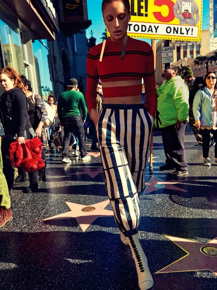 /British model Adwoa Aboah is styled by Jillian Davison in 'Work Your Look'. Photographer Robbie Fimmano flashes the color-drenched, streetside extravangaza for Glamour Magazine March 2017./ Makeup by Stoj; hair by Ramsell Martinez