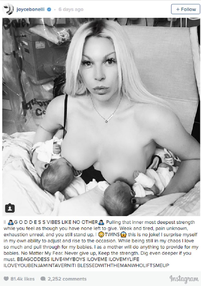 Celebrity makeup artist Joyce Bonelli is a breastfeeding new mom, and she has twins to feed. Best known for working with Kim, Khloe, and Kourtney Kardashian as well as Kylie Jenner, the new mom posted this shot on Instagram Tuesday, December 28.